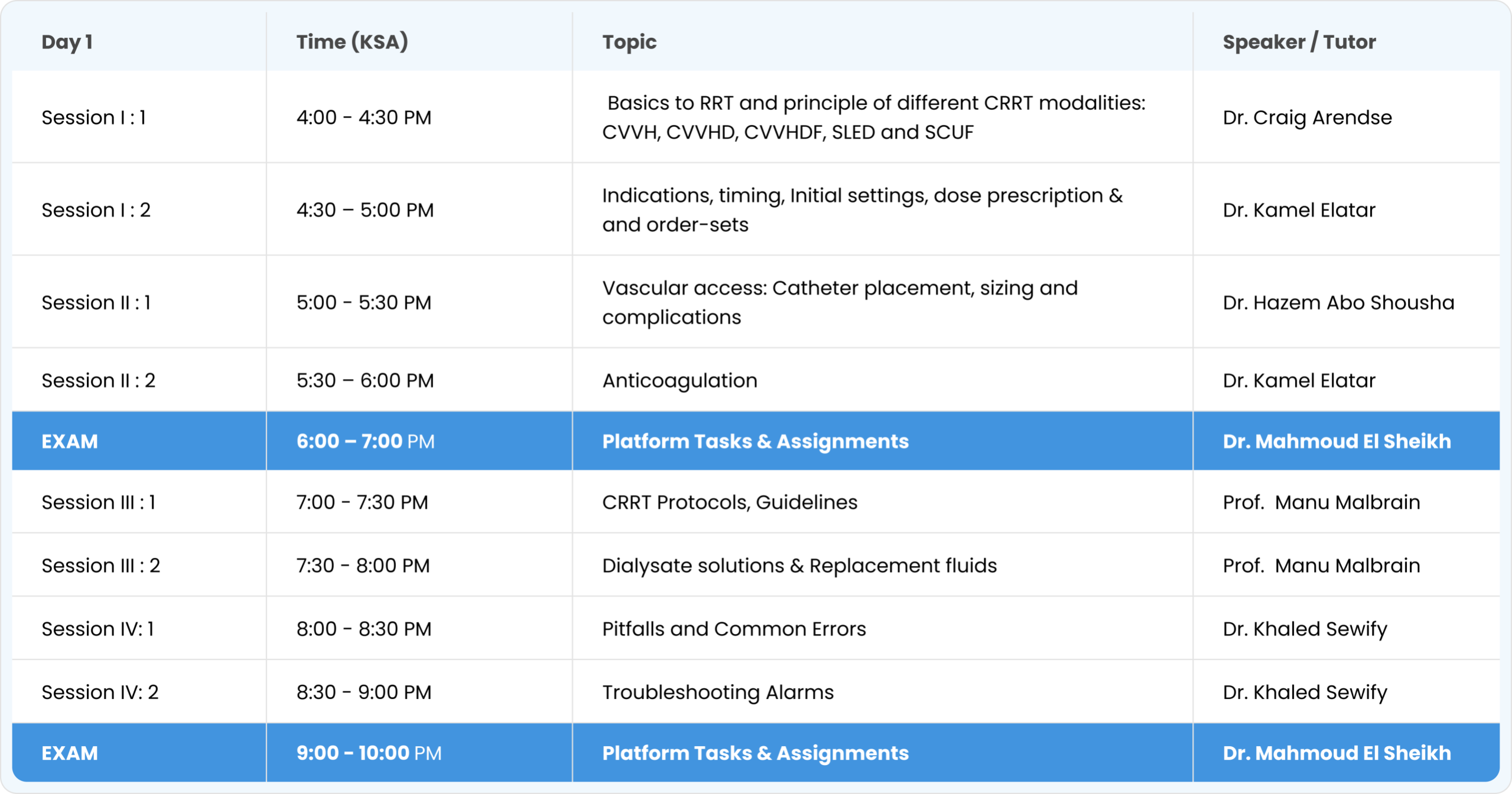 Across 12 hours of learning and evaluation, participants will gain hands-on insights into the principles, settings, troubleshooting, and advanced applications of CRRT, ensuring they are fully equipped to apply this life-saving therapy in practice.
